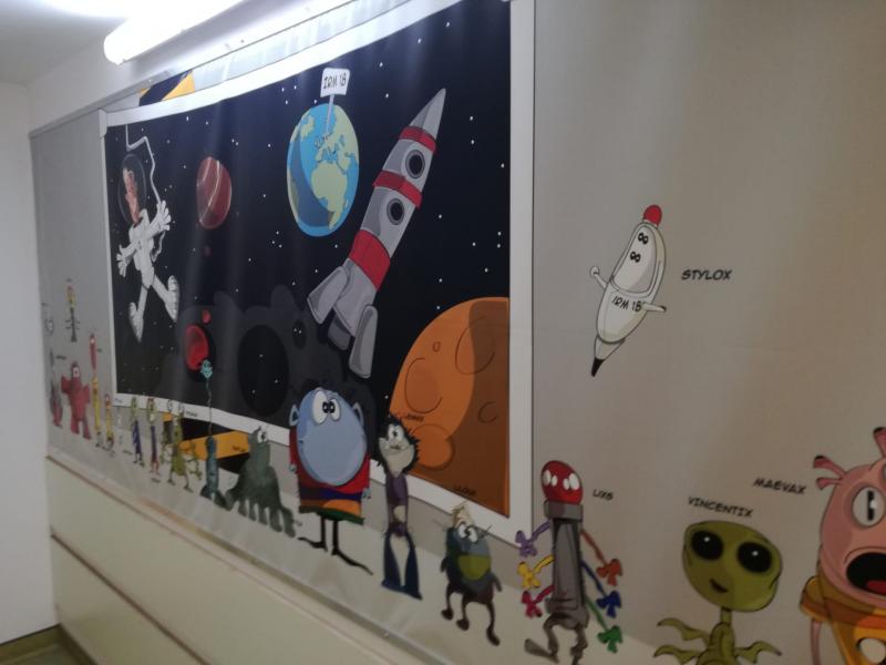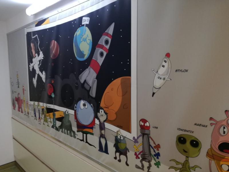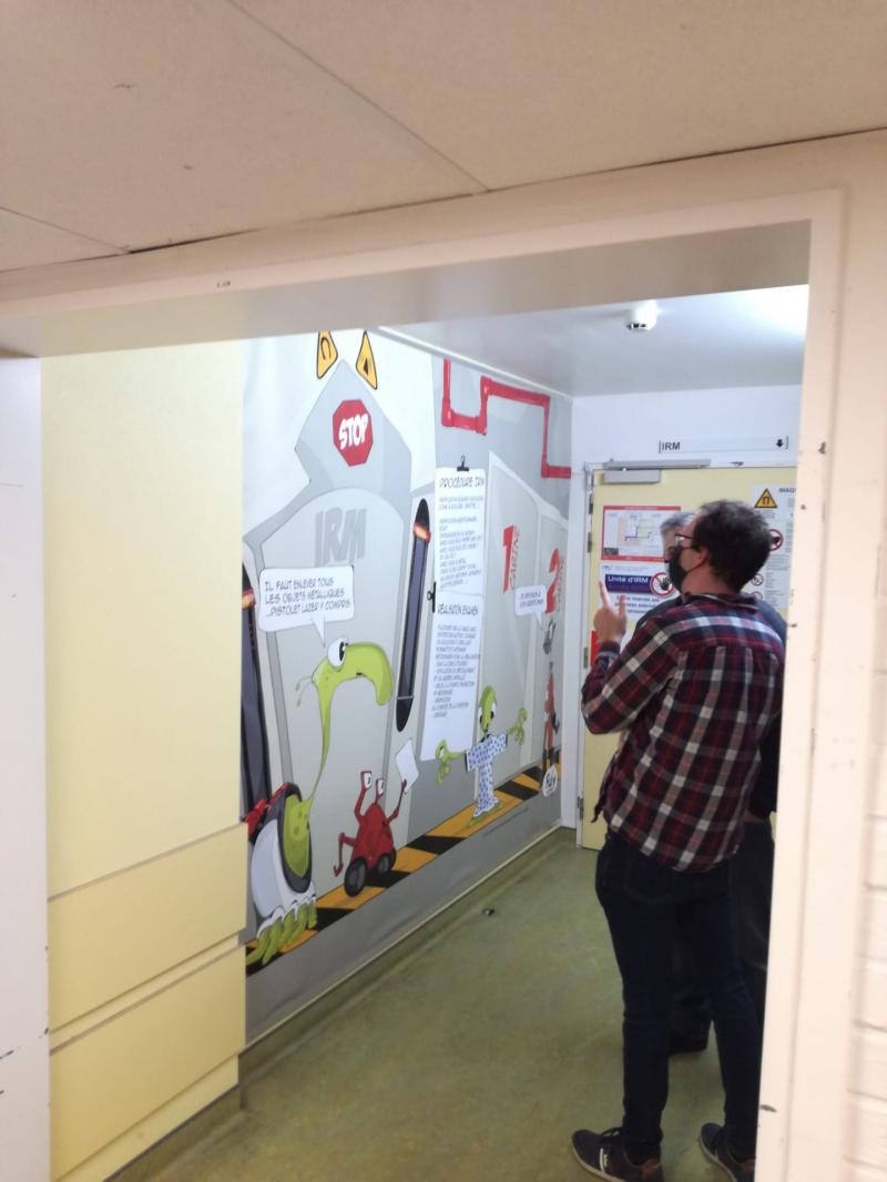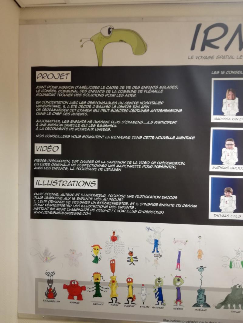 À présent, tout patient venant pour l’examen IRM passe par la salle d’attente où est présenté, en illustration cartoon, une histoire invitant les enfants, tels des astronautes, à passer un examen IRM de façon plus amusante et surtout moins stressante.