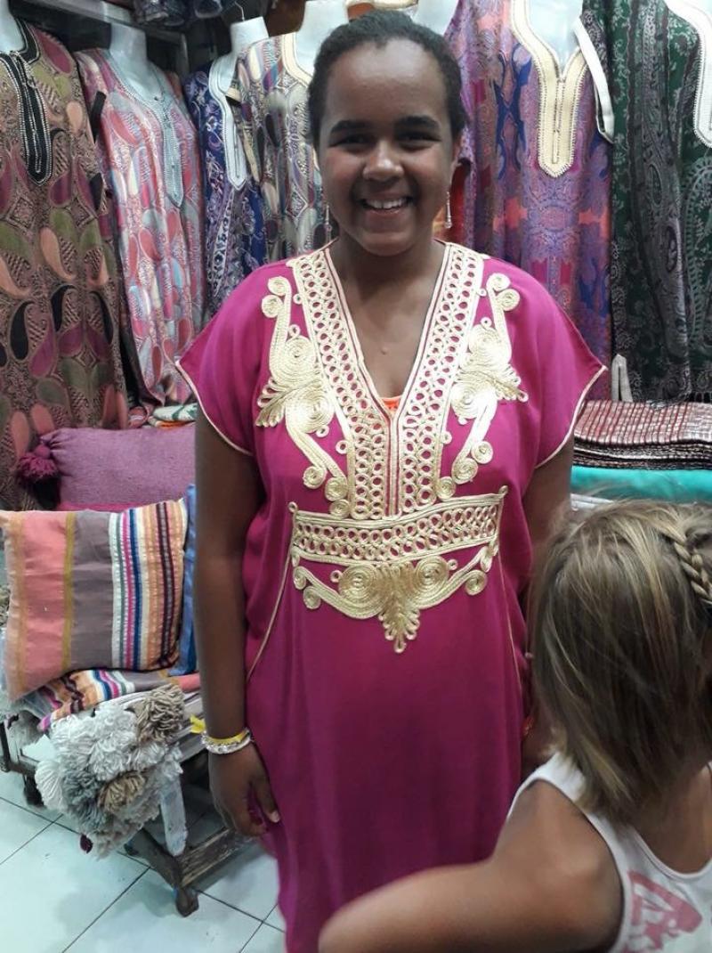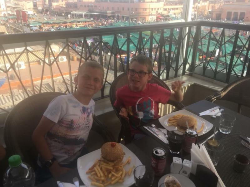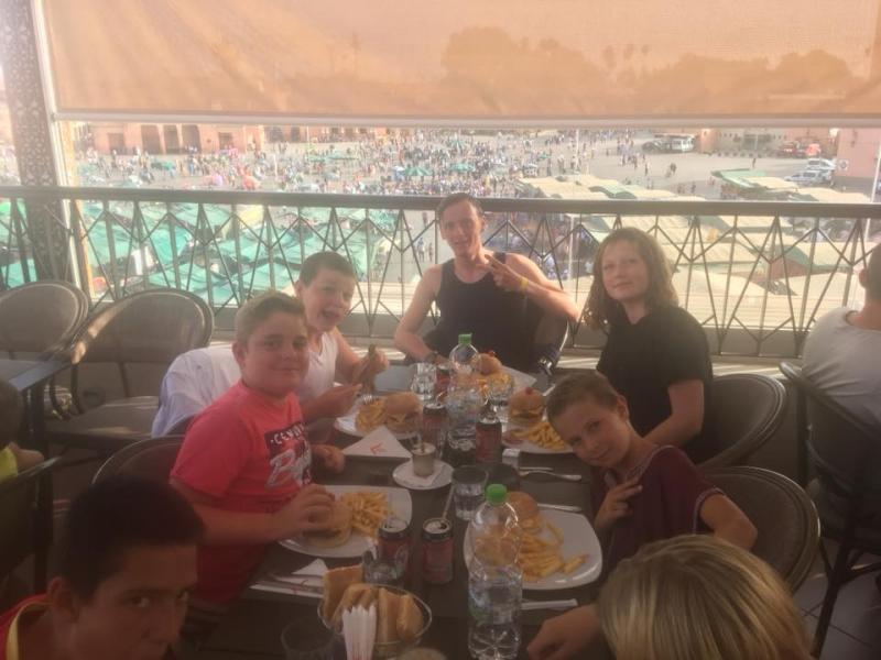 Pour notre dernier jour, nous profitons de la belle piscine du domaine. Aprèsmidi, nous allons à Marrakech, sur la place Jeema el Fna. Nous découvrons les charmeurs de serpents et les singes. Nous allons acheter des souvenirs dans les souks, que c’est beau, on se croirait dans Aladin! Après nos achats, on nous emmène dans un beau restaurant avec une vue sur la place! On mange là-bas, c’est délicieux, et pendant qu’on mange, on voit le soleil se coucher sur la place, c’est un moment magique pour tout le monde.